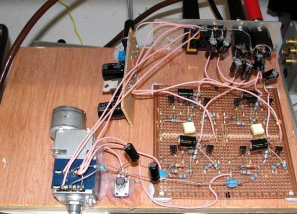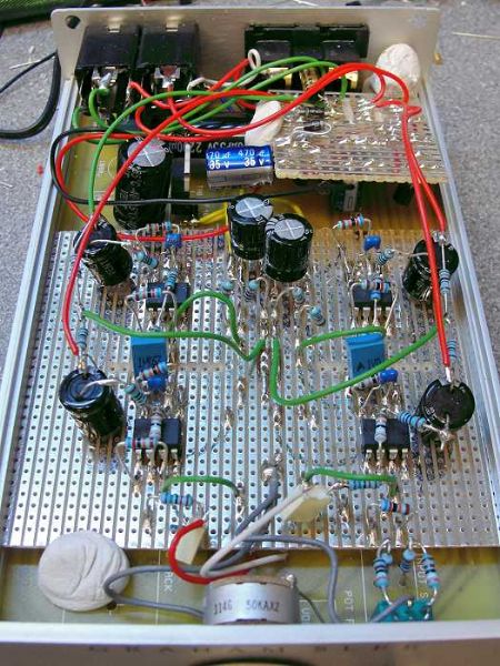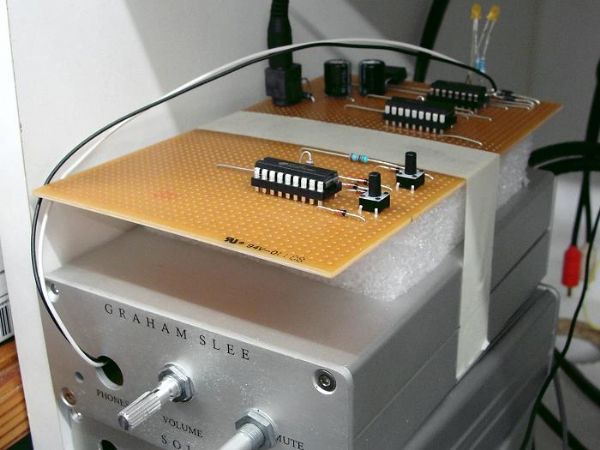 The active stages are now very sonically acceptable. You may note that it's not discrete anymore. Why? The reason was that no matter which discrete configuration was used, it didn't return a specification performance I felt would appeal to a majority of would-be customers. There are discrete transistor configurations capable of such specifications but they are far from linear in an open-loop condition, which kind of destroys the intention. Therefore it's been "keyhole surgery" time with an op-amp having an output stage that's the most musical I ever heard, but whose input is only sufficiently linear in its inverting mode. That's not a problem here as I need a double inversion to provide the phase and anti-phase signals for the balanced outputs, so both sections are inverting and hence very linear. The "keyhole surgery" took care of the remaining ultra-linear requirement of very much wider open loop frequency response - more than the audio spectrum! Here's a photo of the "rats-nest" breadboard which got a little more complicated with the addition of an output relay circuit to protect against naughty switch on and switch off noises. Such a board is dead simple if you have an inbuilt a.c. supply but as this is ran off a DC supply (PSU1) it's a bit more of a challenge, and the output relays have to be operated either on mains-fail or if someone unplugs/re-plugs the DC. Believe it or not, in this messy form it works, it measures great and it sounds sublime. ![]() The next photo shows the remote control evaluation board strapped on top of the prototype Aria with an insulating block and masking tape - "appropriate technology" for evaluation purposes. The infra red parts are missing at this point in time - this stage is to test that the encoder and decoder are communicating which they are. ![]() The furthest section comprises two chips and is the receiver section which will be inside the preamp (we may offer a manual version with the receiver missing if there is a demand). The nearest section is the transmitter. Both sections can be easily shrunk down to the appropriate sizes. The remote control is a very simple and unique one designed to ensure there's no interference between it and any other remote controls. And just in case somebody else stumbles on this idea we can easily change the addresses. |