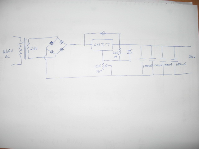 "It uses a quality 240/24 volt transformer, diode rectifier set, followed by a LM317 voltage regulator and 4 1000uf caps."
