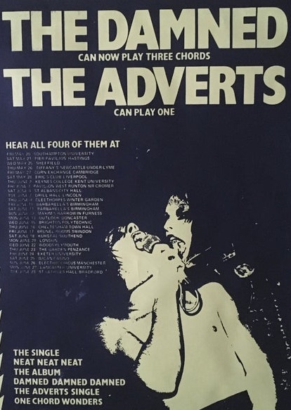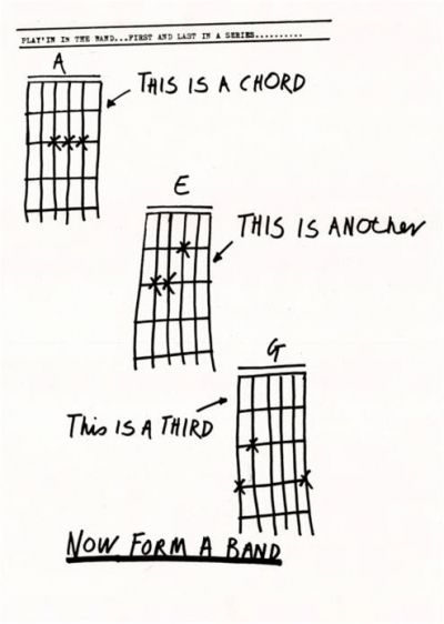 ![]() "Sniffin' Glue is often incorrectly credited as the source of the illustration featuring drawings of three guitar chord shapes, captioned, 'this is a chord, this is another, this is a third. Now form a band'; this drawing actually originally appeared in January 1977 in another fanzine, Sideburns..." (Wikipedia) Mind you, some people felt that three chords were altogether too many...