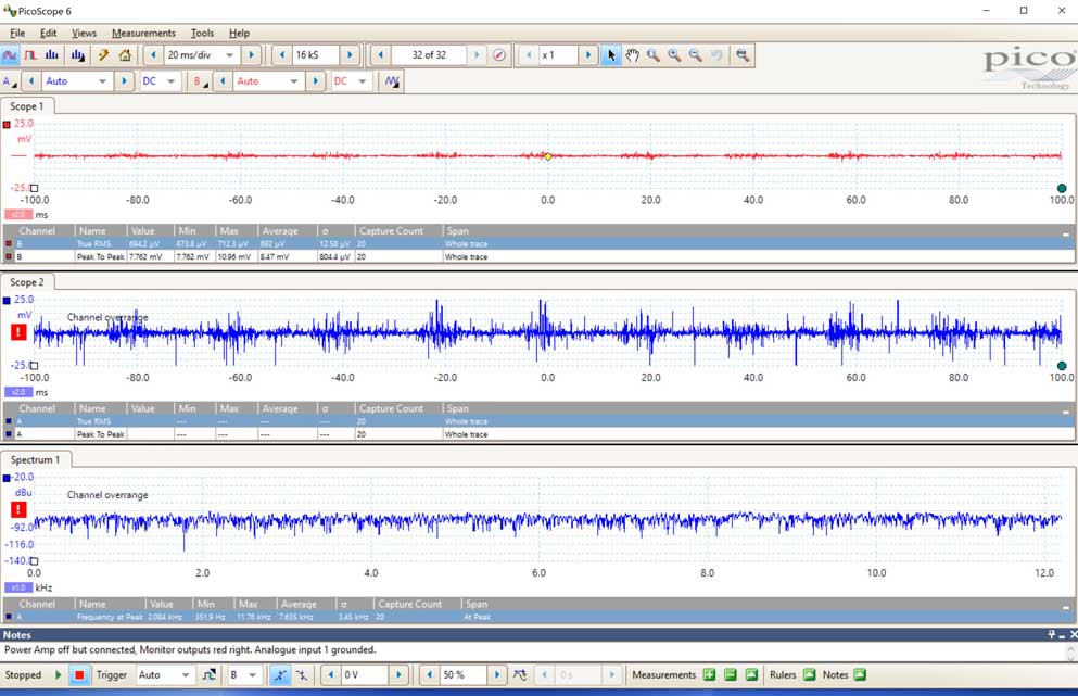 Scope snapshot of best case noise. Red = Right channel, Blue = Left Channel, Spectrum of Left channel