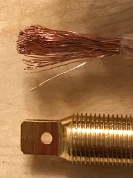I used Spatia wire, it's much thinner. For the thicker cable cut a few strands out so that you can thread it through the hole or make the hole bigger then solder. It will need a quite a bit of heat/time for the heavy brass part to get hot enough for the solder to flow. It's generally good practise to "tin" the parts first, ie apply a small amount of solder to coat each part before you bring them together, usually helps in getting the heat into the heavier part before you apply solder. Ian